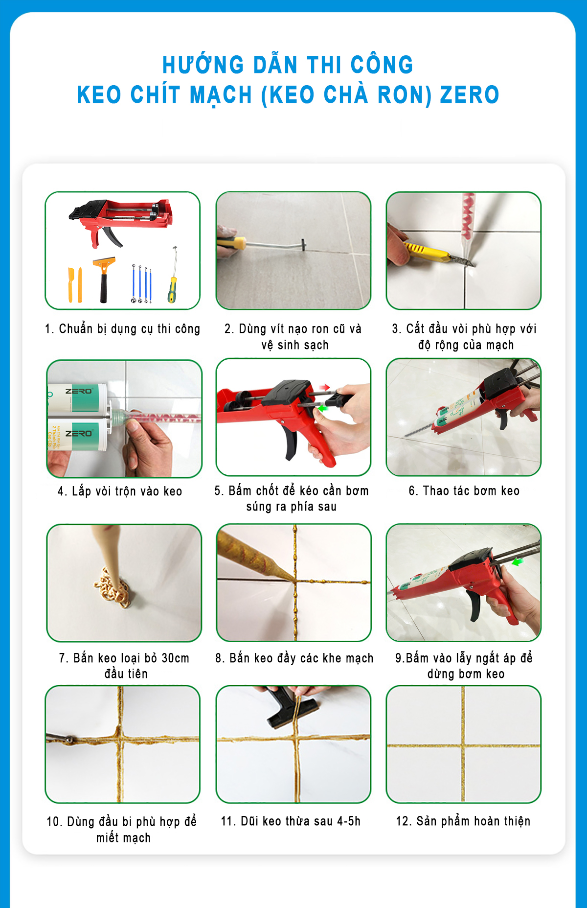 – Điều đầu tiên phải khẳng định việc thi công keo chít mạch Zero rất dễ dàng, đơn giản. Thay bằng việc phải hoà với nước và đổ ra sàn, rồi đi lau chùi từng tí một như các loại bột truyền thống, thi công keo Zero đơn giản đến nỗi chủ nhà cũng tự thi công được, không nhất thiết phải cần đến thợ.